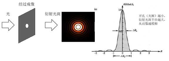 鏡頭分辨率和本身光圈大小(或者NA)有關。鏡頭成像本身就是一個光學衍射的過程,當然孔越小(F數越大),衍射斑越重,從而造成分辨率下降,如下圖