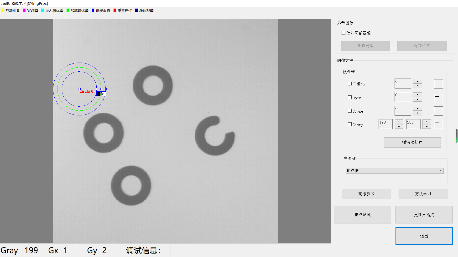 該方(fang)法首先進行(xing)斑(ban)點(dian)分(fen)析(xi)(xi),找到符(fu)合條(tiao)件的圓(yuan)形斑(ban)點(dian),再使用(yong)圓(yuan)工具對(dui)圓(yuan)形斑(ban)點(dian)進行(xing)幾何特(te)征分(fen)析(xi)(xi)。