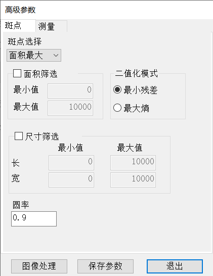 斑點(dian)分析的前提(ti)是把斑點(dian)與背景分割開(kai)來。一般(ban)情況(kuang)下,默認(ren)使(shi)用(yong)(yong)【最小殘(can)差】即可處理(li)絕(jue)大部分的圖像(xiang)。當圖像(xiang)明暗不明顯,或斑點(dian)與背景對比不明顯時(shi),使(shi)用(yong)(yong)【最小殘(can)差】的效果(guo)(guo)將受到(dao)(dao)影響(xiang),這時(shi)使(shi)用(yong)(yong)【最大熵】會(hui)得到(dao)(dao)較理(li)想的效果(guo)(guo)。