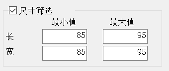 通過設置尺寸(cun)的(de)(de)最(zui)小(xiao)值(zhi)、最(zui)大值(zhi),進行斑(ban)點(dian)篩選。尺寸(cun)(長、寬)在最(zui)小(xiao)值(zhi)、最(zui)大值(zhi)之間(jian)的(de)(de)斑(ban)點(dian)被保(bao)留,之外的(de)(de)斑(ban)點(dian)被剔(ti)除。