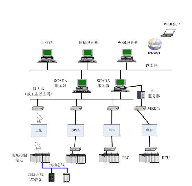 SCADA系統在結構上體現為上、下位機的結構,下位機完成設備的直接控制,而上位機側重于信息集中管理,上、下位機通過通信網絡連接。由于SCADA系統的控制對象分布可能極為分散,因此,SCADA系統的通信通常比DCS要復雜,通信的形式也會多種多樣。