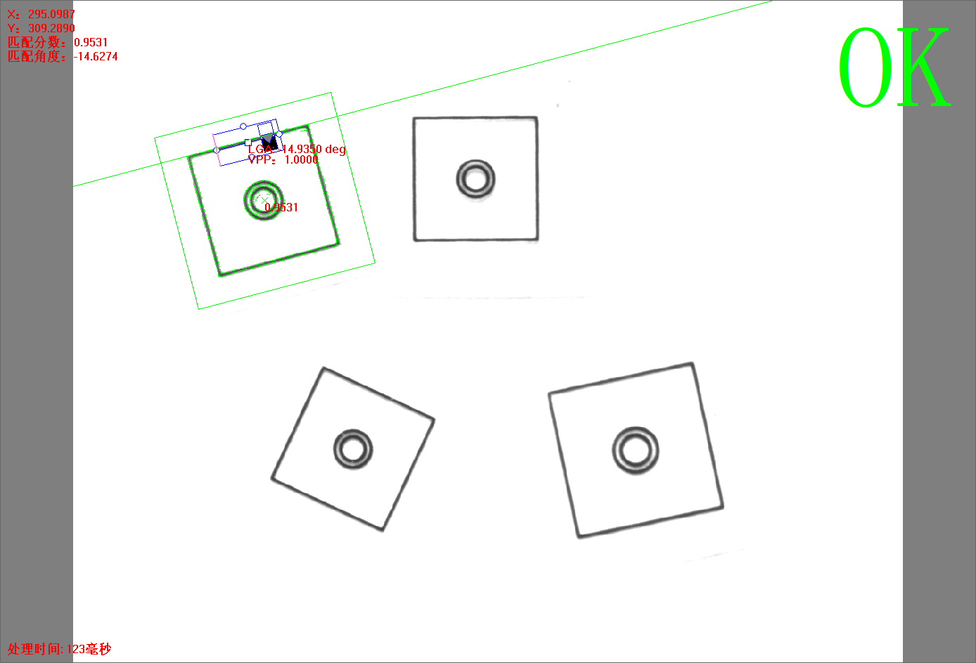 圖像(xiang)中的目(mu)(mu)標發生(sheng)角度(du)變化,設置角度(du)容差,即可更(geng)好地(di)尋找角度(du)發生(sheng)旋轉的目(mu)(mu)標。