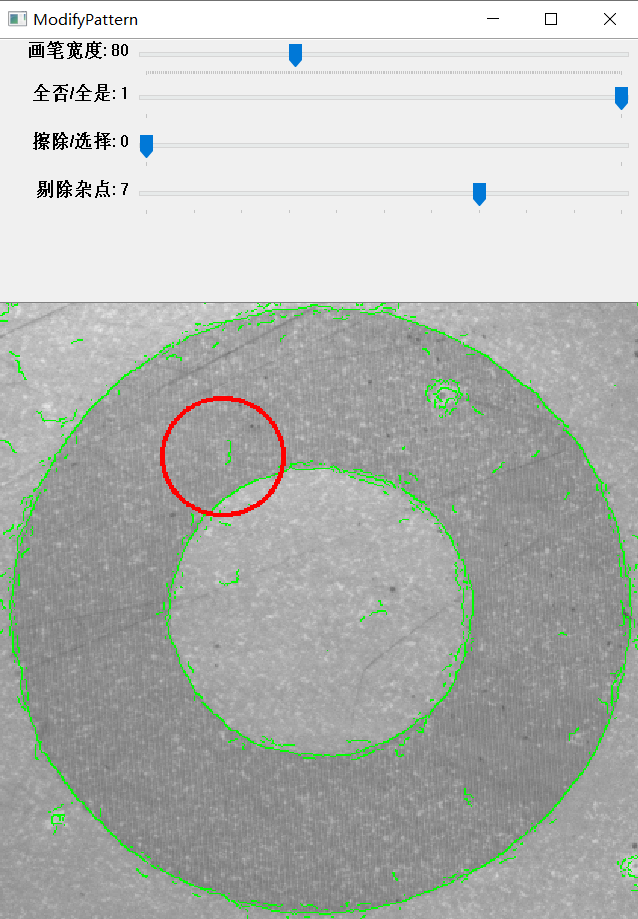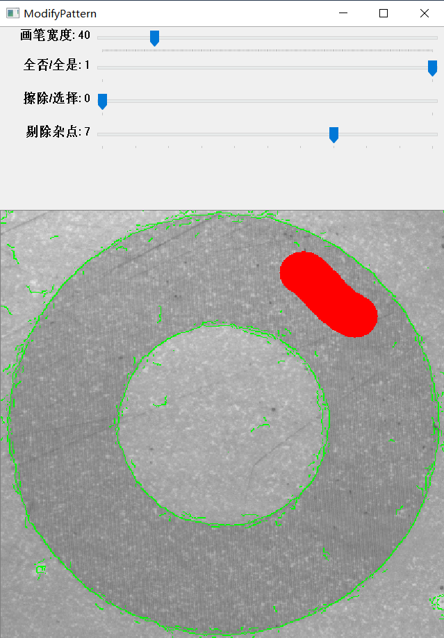 如模板存在干擾的邊緣(yuan)特征點(dian)(dian)(dian),可以對模板輪(lun)廓進行修改優(you)化,從(cong)而(er)改善(shan)輪(lun)廓匹配搜索目標的性能。算法在提取(qu)邊緣(yuan)特征點(dian)(dian)(dian)時,將不再(zai)考慮被涂的紅色區(qu)域內的特征點(dian)(dian)(dian)。