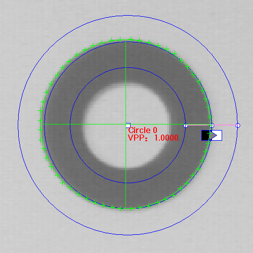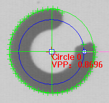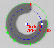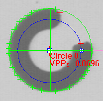 該參(can)數表示參(can)與擬(ni)合圓的有效點(dian)數量占(zhan)總測量路徑數量的百分(fen)比(bi)。由于邊緣殘缺或部分(fen)邊緣點(dian)被剔(ti)除等情(qing)況,使(shi)得參(can)與擬(ni)合圓的邊緣點(dian)數目減少(shao),但(dan)不能(neng)低于該參(can)數值,否則測量失敗。下圖中,有效點(dian)比(bi)例VPP:0.8182