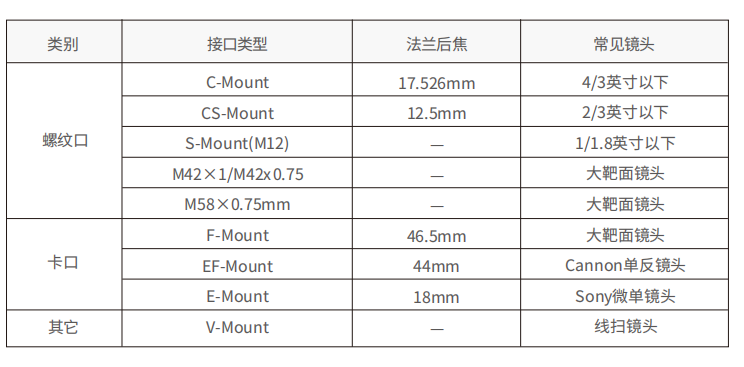 相(xiang)機(ji)(ji)接(jie)口為相(xiang)機(ji)(ji)與(yu)鏡(jing)頭(tou)的(de)連接(jie)方式,保證(zheng)鏡(jing)頭(tou)安裝緊固不(bu)松動和鏡(jing)頭(tou)所需后(hou)焦。鏡(jing)頭(tou)法蘭口即鏡(jing)頭(tou)安裝承靠面與(yu)成像(xiang)面的(de)距離(li)稱為法蘭后(hou)焦,不(bu)同鏡(jing)頭(tou)的(de)法蘭后(hou)焦不(bu)同,影響鏡(jing)頭(tou)對(dui)焦距離(li)、清晰度。