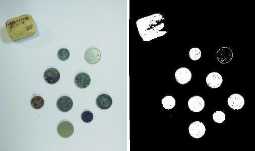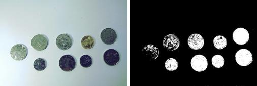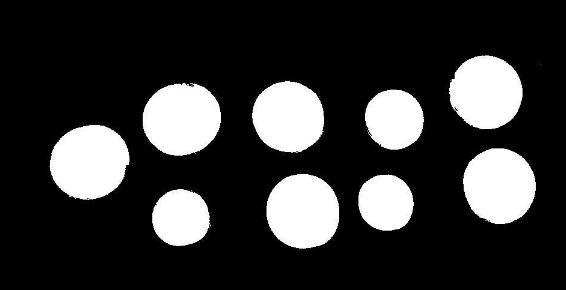 之后僅對既有物體又有背景的塊進行自動閾值處理、二值化、填充孔洞,可以得到圖6的結果,可以看到每個硬幣都被很好的分割出來: