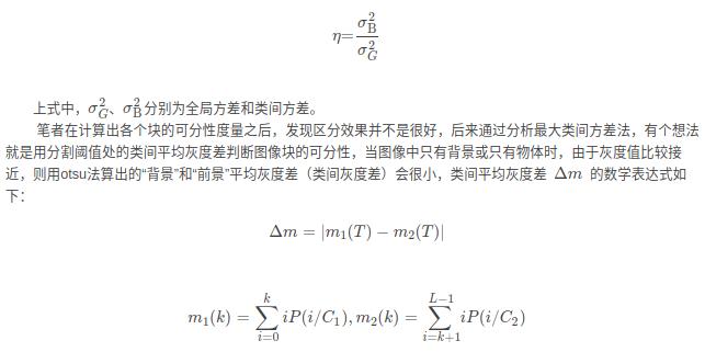筆者在計算出各(ge)個(ge)塊的(de)可分性(xing)度量之后,發現(xian)區分效(xiao)果(guo)并不(bu)是很(hen)好,后來通過分析最大類(lei)間方差(cha)法(fa)(fa),有個(ge)想法(fa)(fa)就是用分割閾值(zhi)(zhi)處的(de)類(lei)間平(ping)均灰度差(cha)判斷圖(tu)像塊的(de)可分性(xing),當圖(tu)像中(zhong)只(zhi)有背景或只(zhi)有物體時,由于灰度值(zhi)(zhi)比較(jiao)接近,則用otsu法(fa)(fa)算出的(de)“背景”和(he)“前景”平(ping)均灰度差(cha)(類(lei)間灰度差(cha))會(hui)很(hen)小。