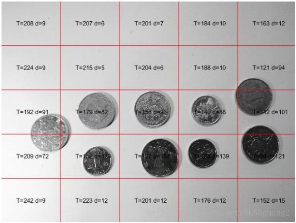 圖5為(wei)分塊(kuai)(kuai)結果,示(shi)例中分塊(kuai)(kuai)與硬幣大小(xiao)相當,分完塊(kuai)(kuai)之(zhi)后(hou)就可以按塊(kuai)(kuai)進行(xing)全局(ju)閾值法(fa)(這(zhe)里(li)采用常用的(de)(de)(de)最大類間方差法(fa),otsu法(fa))處(chu)理(li)了,但(dan)是需(xu)要注意的(de)(de)(de)是有(you)的(de)(de)(de)塊(kuai)(kuai)中只有(you)背景(jing),這(zhe)個(ge)時候需(xu)要進行(xing)判斷(duan),排除對這(zhe)種塊(kuai)(kuai)的(de)(de)(de)處(chu)理(li)。