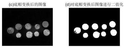 由于原(yuan)圖是(shi)背景亮,前(qian)景暗(an),對(dui)原(yuan)圖進行底帽變(bian)(bian)換(huan)以解決光(guang)照不均勻(yun)的問題,這里先(xian)給出處(chu)理結(jie)果,如(ru)下圖,可(ke)以看到底帽變(bian)(bian)換(huan)后的圖像刪除了大(da)部分非均勻(yun)背景,最后閾(yu)值處(chu)理后,左邊的硬(ying)幣被(bei)分割出來,有少量殘缺,但是(shi)影響不大(da),后續可(ke)以通過形態學的其他處(chu)理將(jiang)殘缺補齊。