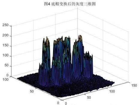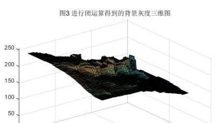 通過選取大于硬幣大小的合適結構元,可以看成一個球體在灰度曲面上滾動,球體下表面的軌跡構成閉運算的曲面,如圖3所示,原圖中的凹陷都被填上,可以近似代表不均勻的背景。閉運算完之后再減去原圖像即可得到背景近似均勻的圖像,如圖4所示,對應的灰度圖可以看圖1(c),可以看到不均勻的背景被大致去除,這將十分有助于后面的閾值分割。