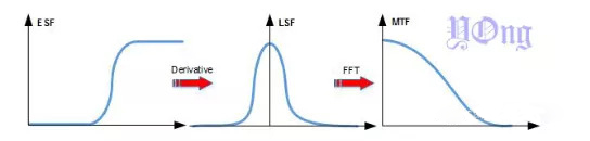 傾(qing)(qing)斜邊(bian)緣(yuan)法的(de)算法流程(cheng)下圖,首先獲取傾(qing)(qing)斜邊(bian)緣(yuan)的(de)邊(bian)緣(yuan)擴散函數(shu)(ESF),然后(hou)求(qiu)導得到對應(ying)的(de)線擴散函數(shu)(LSF),最后(hou)傅里葉變換得到MTF。