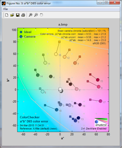 色(se)(se)彩(cai)(cai)還(huan)原指彩(cai)(cai)色(se)(se)CCD、CMOS經過(guo)拍攝加(jia)工(gong)后(hou),彩(cai)(cai)色(se)(se)攝影(ying)畫面的(de)(de)色(se)(se)彩(cai)(cai)大體上和(he)原景(jing)物(wu)的(de)(de)色(se)(se)彩(cai)(cai)相一致。影(ying)響色(se)(se)彩(cai)(cai)還(huan)原的(de)(de)因素有CCD、CMOS的(de)(de)性能,攝影(ying)鏡頭的(de)(de)質量,光線的(de)(de)色(se)(se)溫等(deng)。今(jin)天我(wo)們通過(guo)在D65光源(yuan)下測(ce)試攝像頭對色(se)(se)彩(cai)(cai)的(de)(de)還(huan)原能力來聊聊如何使用Imatest進行色(se)(se)彩(cai)(cai)還(huan)原測(ce)試。