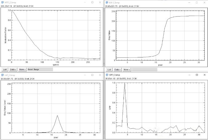 可以得到如(ru)下4張(zhang)圖表(biao)(biao),除了(le)MTF外(wai)還有ESF、LSF、SPP,比較方便的(de)一(yi)點是我們通(tong)過Data-Add將(jiang)不(bu)同的(de)MTF曲線添加(jia)至一(yi)張(zhang)圖表(biao)(biao)中進行對比分析。
