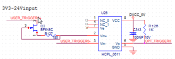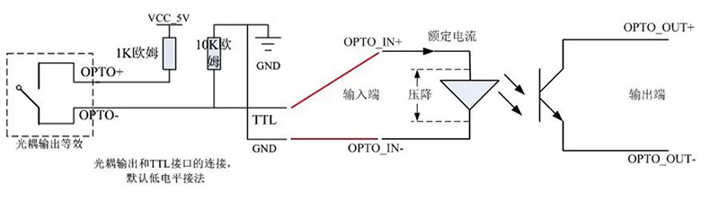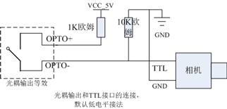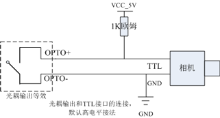 可連接光耦輸入接口的相機,將輸出端的光耦信號通過上拉電阻或下拉電阻,轉為TTL信號后,再觸發輸入端的光耦合電路。