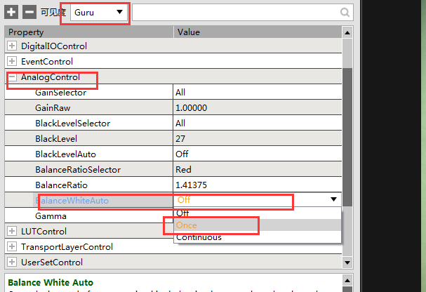 選擇Guru模式,在(zai)AnalogControl選項(xiang)下(xia)BalanceWhiteAuto下(xia)拉點取(qu)Once后采集,自動(dong)跳(tiao)成(cheng)off,