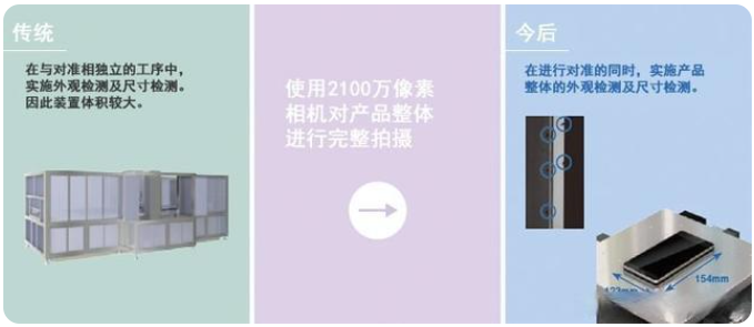3.在與對準相獨立的工序中,實施利用視覺系統的外觀/尺寸檢測 。除了(le)對準,在其他獨(du)立(li)工(gong)序中實施外觀檢(jian)測及(ji)尺(chi)寸檢(jian)測的案例還有(you)很多,只要用2100萬(wan)像素相機(ji)對產(chan)品整(zheng)體(ti)(ti)進行完整(zheng)拍攝,就(jiu)能(neng)同時進行對準和產(chan)品的整(zheng)體(ti)(ti)外觀檢(jian)測。最終有(you)助于減小生產(chan)設(she)備的體(ti)(ti)積。