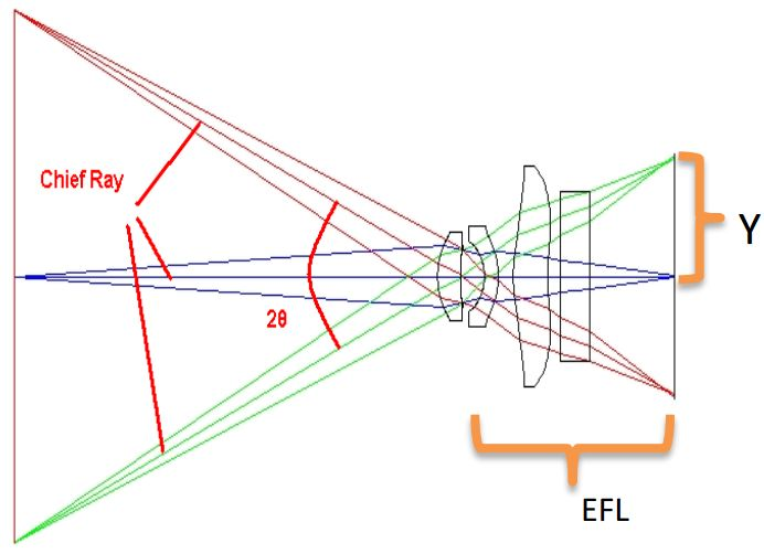 若Y為Sensor的半(ban)對(dui)角(jiao)(jiao)線長度,在不考慮光(guang)學(xue)系統畸變(bian)的前提下(xia),對(dui)角(jiao)(jiao)線視場角(jiao)(jiao)(2θ)=2*arctan(Y/EFL),如(ru)下(xia)圖所(suo)示(shi):