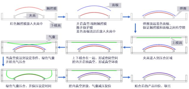 觸(chu)摸薄(bo)膜貼(tie)(tie)(tie)合(he)(he)(he)主(zhu)(zhu)要分為貼(tie)(tie)(tie)合(he)(he)(he)和(he)脫泡(pao)兩個工藝過程,貼(tie)(tie)(tie)合(he)(he)(he)主(zhu)(zhu)要起到定位、初步粘接(jie)作用(yong),此過程中會(hui)存在(zai)一定的(de)氣泡(pao)殘留在(zai)貼(tie)(tie)(tie)合(he)(he)(he)面中;脫泡(pao)起到擠出(chu)氣泡(pao)、強化粘接(jie)效果(guo)的(de)作用(yong)。隨著汽(qi)車電子(zi)的(de)日益發展,汽(qi)車廠(chang)商正在(zai)把重點(dian)逐(zhu)步轉(zhuan)向用(yong)戶(hu)體(ti)驗(yan)和(he)個性(xing)化需求的(de)設計(ji)上(shang),汽(qi)車人機操作界面開(kai)始采用(yong)一體(ti)式和(he)曲(qu)面式。操作面板有了一定的(de)弧度,且面板內(nei)有導柱(zhu)、螺絲柱(zhu)等凸點(dian),與傳(chuan)統(tong)的(de)平面擠壓(ya)貼(tie)(tie)(tie)合(he)(he)(he)和(he)滾壓(ya)貼(tie)(tie)(tie)合(he)(he)(he)有差異(yi),觸(chu)控面板貼(tie)(tie)(tie)合(he)(he)(he)一般采用(yong)真(zhen)空氣囊貼(tie)(tie)(tie)合(he)(he)(he),圖4為觸(chu)摸薄(bo)膜的(de)貼(tie)(tie)(tie)合(he)(he)(he)工藝過程。
