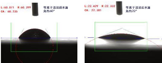 下(xia)圖5顯(xian)示一種(zhong)塑膠材料等離子清潔后水滴角從約60°的(de)變為(wei)約22°,活性增強。