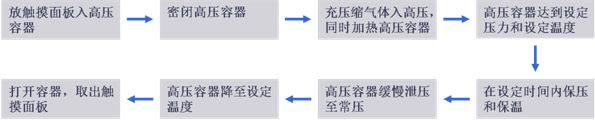 觸控膜放置在高壓、較高溫度的(de)環境(jing)下,可(ke)以擠出膜片(pian)內的(de)氣體,以達到(dao)脫(tuo)泡(pao)(pao)的(de)目的(de)。一般(ban)觸摸(mo)面板(ban)貼合后的(de)氣泡(pao)(pao)小于(yu)2mm,再(zai)經過脫(tuo)泡(pao)(pao)機(ji)脫(tuo)泡(pao)(pao)處理后,氣泡(pao)(pao)都可(ke)以消除;過大(da)的(de)氣泡(pao)(pao)需要先采用單(dan)點脫(tuo)泡(pao)(pao)。脫(tuo)泡(pao)(pao)過程(cheng)如圖6所示。