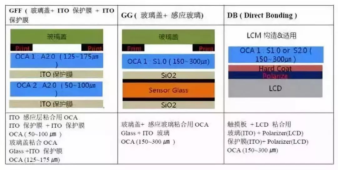 目前,市場(chang)上常見的(de)OCA產品結構(gou)有(you)以下(xia)幾種,取決于(yu)TP廠的(de)裝配(pei)設計(ji)。