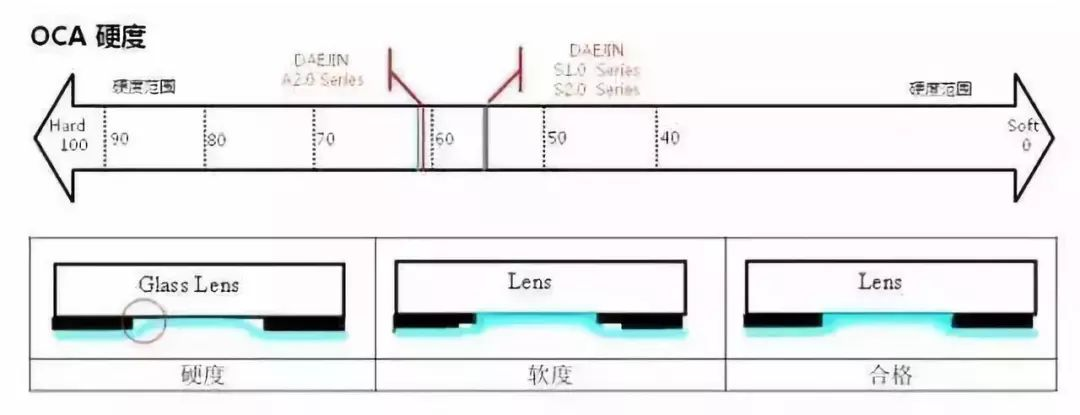 OCA不同的(de)厚(hou)度會(hui)有一個對應的(de)硬(ying)(ying)(ying)度值,太硬(ying)(ying)(ying)或(huo)太軟都會(hui)影響全貼(tie)合的(de)使(shi)用,一般的(de)硬(ying)(ying)(ying)度控制值58-65之間(jian)。