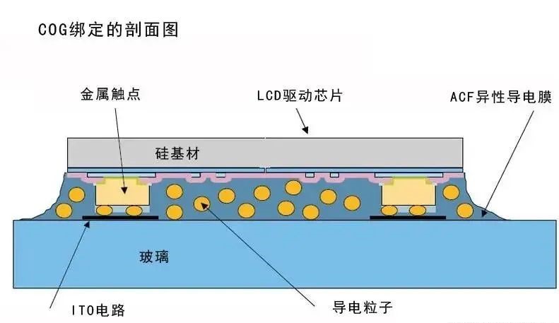 對于(yu)COG顯示(shi)模塊的組成,需要三個組件(jian),如(ru)圖(tu)所示(shi):液晶面板、驅動IC和ACF(連接介(jie)質)。