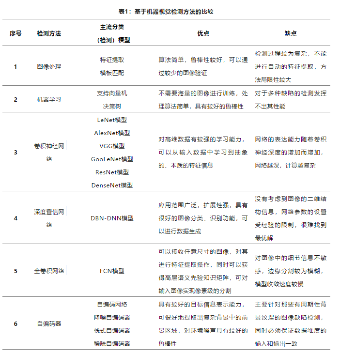 基于機器視覺的(de)缺(que)陷檢(jian)測(ce)(ce)方(fang)法(fa)的(de)比較如表1所示(shi),包(bao)括各種(zhong)方(fang)法(fa)的(de)主流(liu)分類(檢(jian)測(ce)(ce))模型、優缺(que)點對比。