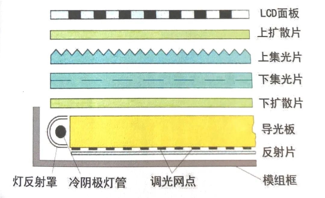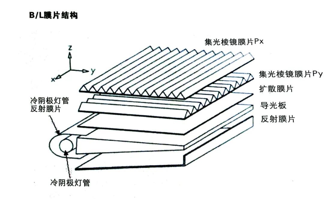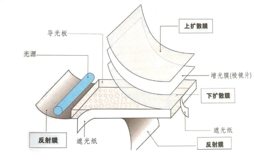 主要組成為發光源(Light source) 、導光板(light guide plate) 、膠(jiao)框(kuang)(housing) 、反射片(Reflector) 、擴散片(Diffuser) 、增光片(BEF、棱鏡(jing)片)、黑白膠(jiao)(Curtain Tape) 等。