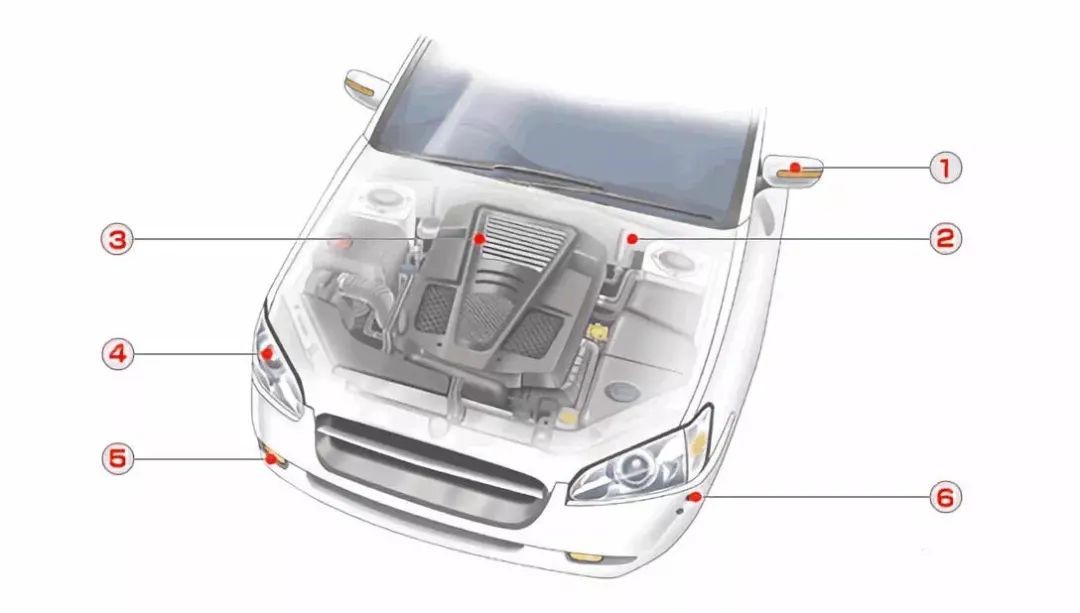 ① 車用閃光燈:防水、提高遮光性② 引擎蓋隔壁:隔熱、防噪音③引擎封條/電池封條:吸收震動、防止物體碰撞噪音④ 汽車前燈:防水、提高遮光性⑤ 霧燈:防水、提高遮光性⑥ 邊角感應器&邊角照相機:防塵、防水