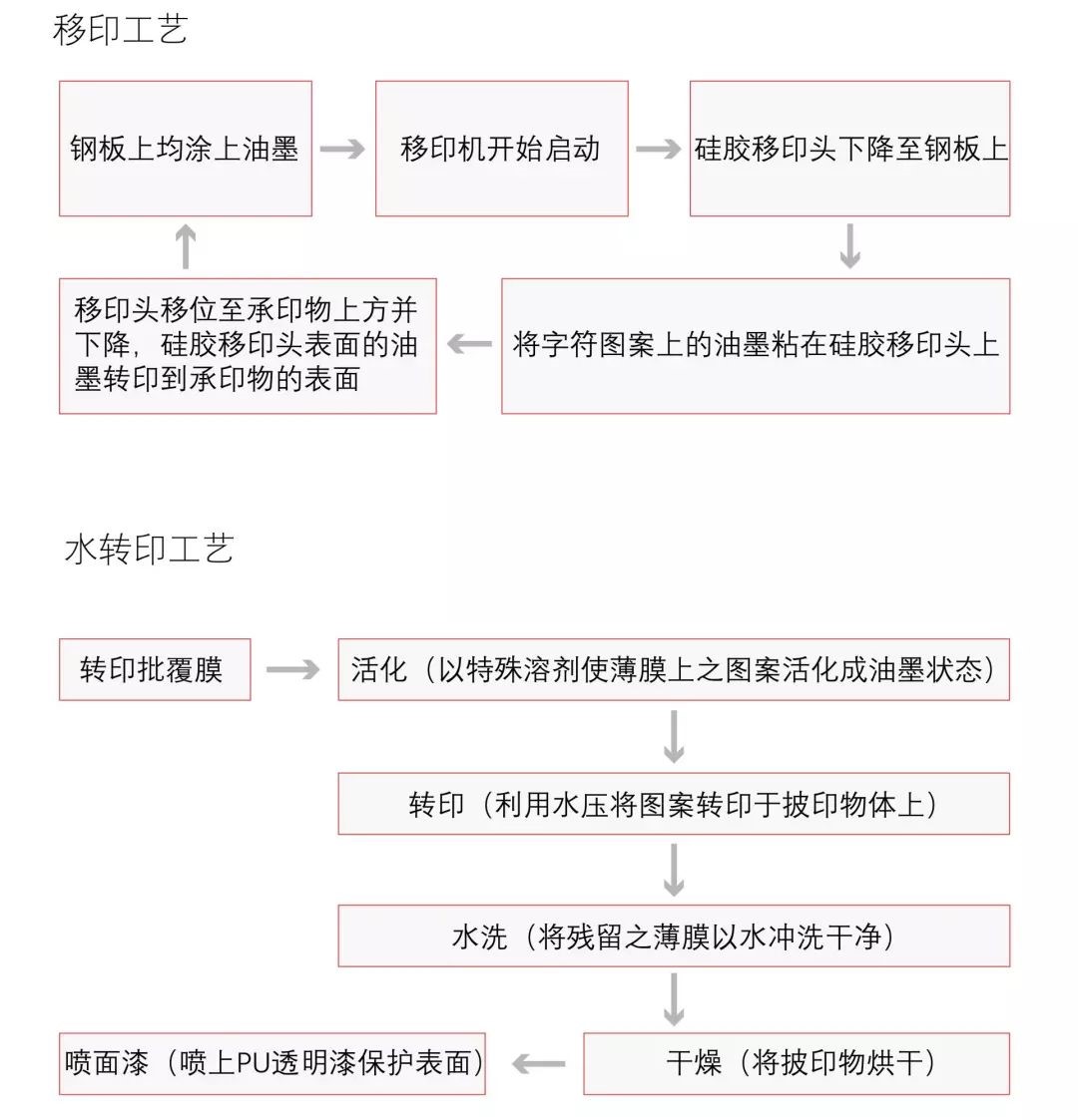 轉(zhuan)印批覆(fu)膜→活(huo)化(以特殊溶劑使薄膜上(shang)之圖案(an)活(huo)化成(cheng)油墨狀態)→轉(zhuan)印(利用水(shui)(shui)壓將(jiang)圖案(an)轉(zhuan)印于披印物體(ti)上(shang))→水(shui)(shui)洗(將(jiang)殘留之薄膜以水(shui)(shui)沖洗干凈)→干燥(將(jiang)披印物烘干)→噴(pen)面漆(噴(pen)上(shang)PU透明漆保護(hu)表面)