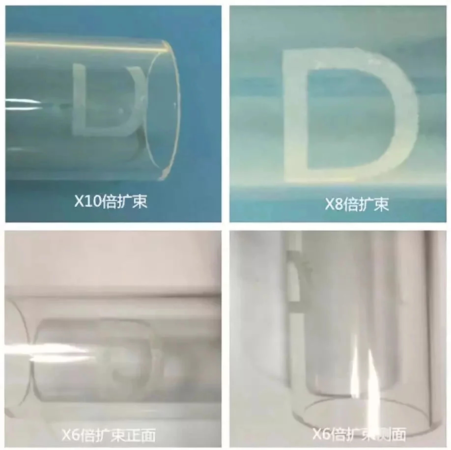 采(cai)用一次(ci)激(ji)光輻射(she)(she)在玻璃表面產生輪廓顯而(er)易見的(de)標記,幾天后激(ji)光擴展到原標記外附近區域形成碎片(pian),再采(cai)用多(duo)次(ci)輻射(she)(she),使(shi)與標記區域相鄰的(de)區域通過熱(re)傳(chuan)導被加熱(re),使(shi)這些區域形成應力梯(ti)度,從而(er)減(jian)少(shao)二次(ci)破裂可能性(xing),采(cai)用這種(zhong)方法在鈉(na)鈣(gai)玻璃和(he)硼硅酸鹽(yan)玻璃上打標十分有效(xiao)。裝盛液(ye)體(ti)藥劑的(de)小型玻璃瓶(ping)、生活中的(de)玻璃杯(bei)都可以使(shi)用這種(zhong)方法打標。