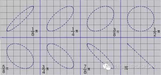 但(dan)是,如果O光(guang)(guang)與E光(guang)(guang)之間的(de)位(wei)相(xiang)差不(bu)是90度,則合成(cheng)的(de)光(guang)(guang)就會是不(bu)同橢(tuo)園度的(de)橢(tuo)園偏振(zhen)光(guang)(guang)(或者線偏振(zhen)光(guang)(guang))。下圖列出了幾種不(bu)同位(wei)相(xiang)差時的(de)情況。