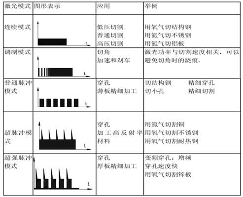 在(zai)(zai)連續模式(shi)下(xia),激光(guang)輸出(chu)的(de)(de)(de)(de)(de)(de)(de)功(gong)率(lv)是(shi)恒定的(de)(de)(de)(de)(de)(de)(de),這使得(de)進(jin)入板料(liao)的(de)(de)(de)(de)(de)(de)(de)熱量比(bi)較均(jun)勻,它適(shi)合于一般情(qing)況(kuang)下(xia)較快速(su)的(de)(de)(de)(de)(de)(de)(de)切割(ge),一方(fang)面(mian)可以(yi)提高工作效率(lv),另一方(fang)面(mian)也(ye)是(shi)避免熱量集中導致熱影響區(qu)組(zu)織惡(e)變的(de)(de)(de)(de)(de)(de)(de)需要(yao)。調制模式(shi)的(de)(de)(de)(de)(de)(de)(de)激光(guang)功(gong)率(lv)是(shi)切割(ge)速(su)度的(de)(de)(de)(de)(de)(de)(de)函數,它可以(yi)通過限制在(zai)(zai)各點處(chu)的(de)(de)(de)(de)(de)(de)(de)功(gong)率(lv)使進(jin)入板料(liao)的(de)(de)(de)(de)(de)(de)(de)熱量保持在(zai)(zai)相當的(de)(de)(de)(de)(de)(de)(de)低水平,從(cong)而防(fang)止切縫邊(bian)緣的(de)(de)(de)(de)(de)(de)(de)燒傷。由于它的(de)(de)(de)(de)(de)(de)(de)控制比(bi)較復雜(za),因此效率(lv)不是(shi)很高,只在(zai)(zai)短時(shi)段內使用。脈沖模式(shi)雖可細分為三種情(qing)況(kuang),實質上只是(shi)強度的(de)(de)(de)(de)(de)(de)(de)差別,往(wang)往(wang)根據材(cai)料(liao)的(de)(de)(de)(de)(de)(de)(de)特性和結構的(de)(de)(de)(de)(de)(de)(de)精(jing)度來選擇。