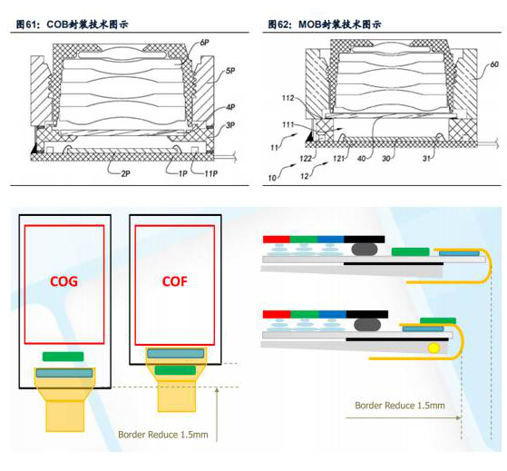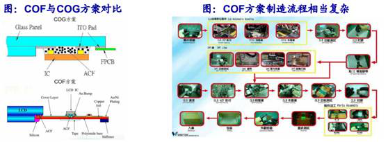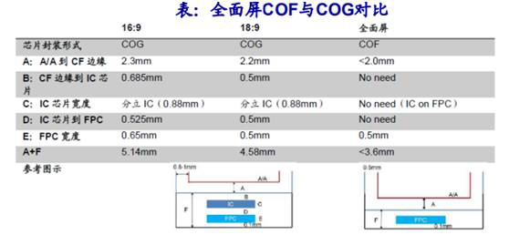 目前手機顯示主要采用COG技術進行驅動芯片的封(feng)裝。18:9顯示屏仍(reng)然可(ke)以采 用COG工藝,但是未來幾(ji)年(nian)隨著(zhu)全面屏從18:9向19:9甚至20:9演(yan)進,COG將(jiang)越(yue)發力(li)不(bu)從心。而采用COF的全面屏,其下端邊框可(ke)能縮小至3.6mm的距離甚至更(geng)小,因此COF將(jiang)滿足更(geng)高屏占比的需求。