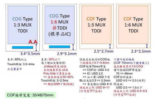 對于(yu)全面屏而言,最佳的(de)方式是基于(yu)COF工藝(即觸控IC固定(ding)于(yu)FPC軟板上(shang)(shang)), 相比于(yu)COG可(ke)以進一(yi)步提升顯(xian)示面積。根據(ju)臺灣工研院的(de)研究數據(ju),盡管采用 COF的(de)1:6 MUX TDDI方案(an)比采用COG的(de)1:3 MUX TDDI的(de)成本(ben)上(shang)(shang)升6.5-9.5美元, 但是下(xia)邊(bian)框尺寸極限可(ke)以由3.4-3.5mm縮減至2.3-2.5mm。