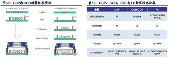 MOB和MOC芯片(pian)封(feng)(feng)(feng)裝(zhuang)(zhuang)技(ji)術(shu)(shu)(shu):在(zai)封(feng)(feng)(feng)裝(zhuang)(zhuang)環節推(tui)動前置CCM小(xiao)型化(hua),有(you)望加速滲透 新(xin)型MOB和MOC封(feng)(feng)(feng)裝(zhuang)(zhuang)技(ji)術(shu)(shu)(shu)相(xiang)比傳(chuan)統的(de)COB等封(feng)(feng)(feng)裝(zhuang)(zhuang)方(fang)式能夠減(jian)小(xiao)模(mo)組尺寸(cun)。目前攝(she)像(xiang)(xiang)頭(tou)芯片(pian)封(feng)(feng)(feng)裝(zhuang)(zhuang)有(you)CSP(Chip Size Package)、COB(Chip On Board)、COF (Chip On FPC)和FC(Flip Chip)技(ji)術(shu)(shu)(shu)四(si)種(zhong),隨著手機攝(she)像(xiang)(xiang)頭(tou)像(xiang)(xiang)素越來越高(gao),主要用于(yu)800萬像(xiang)(xiang)素以下(xia)的(de)CSP技(ji)術(shu)(shu)(shu)地位(wei)下(xia)降(jiang),能夠實現更高(gao)圖像(xiang)(xiang)質量的(de)COB、COF/FC更受青睞。采(cai)用FC封(feng)(feng)(feng)裝(zhuang)(zhuang)得到的(de)模(mo)組會薄1mm,但(dan)成本也較高(gao)。但(dan)在(zai)全面屏趨勢下(xia),需要有(you)新(xin)的(de)技(ji)術(shu)(shu)(shu)將攝(she)像(xiang)(xiang)頭(tou)模(mo)組做(zuo)的(de)更小(xiao)。