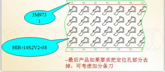 第一把刀(dao)在3M9731上(shang)切(qie)內框和(he)定(ding)位(wei)孔(kong),第二把刀(dao)是在新覆(fu)上(shang)HIR-14S2V2-08的基礎上(shang)整體切(qie)額(e),因為(wei)新覆(fu)的材(cai)料上(shang)是沒(mei)定(ding)位(wei)孔(kong),所以(yi)新覆(fu)的材(cai)料必須讓出(chu)定(ding)位(wei)孔(kong)的位(wei)置,即要求HIR-14S2V2-08比3M9731要窄,而(er)且必須小于產品兩邊定(ding)位(wei)孔(kong)的最小距(ju)離,如圖(tu)所示: