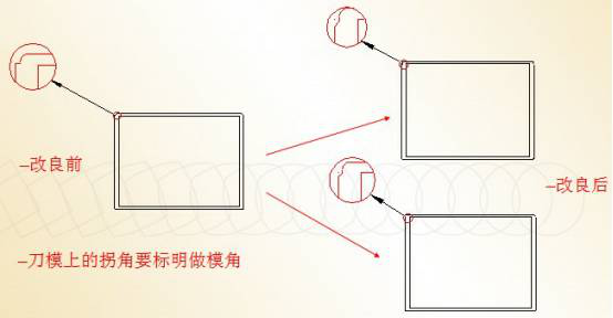 產品拐角的設計,一(yi)般設置為圓角或鈍角,避(bi)免銳角,直(zhi)角,如下圖: