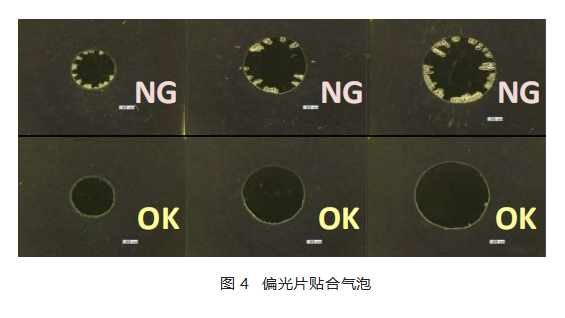 2、所以各大屏(ping)廠工(gong)程師轉(zhuan)換方向(xiang)依靠全貼合(he)OCA解決。起初的全貼合(he)OCA由于填(tian)(tian)充性能不足(填(tian)(tian)充段差(cha)30%),導(dao)致偏光(guang)片邊緣出現圖4的邊緣氣(qi)泡,一直無法解決。