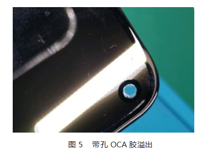 4、在普通全貼(tie)合(he)OCA上(shang)先模切成帶(dai)孔OCA,然(ran)后(hou)和打(da)孔的(de)偏光片精準對位完成全貼(tie)合(he),這個很考驗貼(tie)合(he)精度,對貼(tie)合(he)工(gong)藝要求很高,而(er)且脫泡后(hou)OCA膠很容易(yi)從邊(bian)緣溢出來。如圖5所示:
