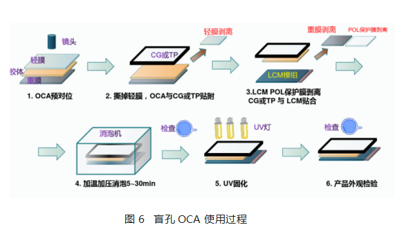 這種樹脂具(ju)備常溫下(xia)普通全貼合OCA的性(xing)(xing)能,能很好(hao)的完(wan)成分切(qie),模(mo)切(qie)等(deng)加(jia)工,不會影響(xiang)尺寸穩定(ding)性(xing)(xing),一旦完(wan)成貼合后在(zai)加(jia)熱加(jia)壓的條件下(xia)具(ju)備很好(hao)的流(liu)動性(xing)(xing),可以很好(hao)的填充(chong)偏(pian)光(guang)片(pian)的圓孔(kong)(kong),照射UV后具(ju)備很好(hao)的信賴性(xing)(xing),盲孔(kong)(kong)OCA使用過程如下(xia)圖6所示: