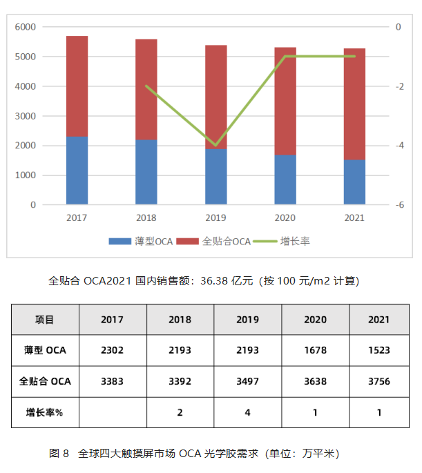 根據(ju)研究機(ji)構于2019年(nian)的(de)調(diao)研數據(ju),2018年(nian)全球(qiu)四大(da)觸摸屏市(shi)場(chang)(智能手機(ji)、平(ping)板電(dian)腦、筆記本電(dian)腦及車載顯示(shi)市(shi)場(chang),不包括返修市(shi)場(chang),下(xia)同)OCA光(guang)學(xue)膠需求量(liang)為(wei)(wei)5586萬(wan)平(ping)米,預計到2021年(nian),全球(qiu)四大(da)觸摸屏市(shi)場(chang)OCA光(guang)學(xue)膠需求量(liang)為(wei)(wei)5279萬(wan)平(ping)米,復合增(zeng)長(chang)率為(wei)(wei)-1.8%,整體市(shi)場(chang)呈下(xia)滑趨勢,但市(shi)場(chang)用量(liang)仍然巨大(da)。