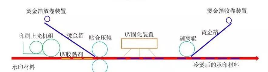 1)在(zai)卷筒承(cheng)印(yin)材(cai)(cai)(cai)料(liao)(liao)上(shang)印(yin)刷(shua)UV膠黏(nian)(nian)劑(ji);2)是對UⅤ膠黏(nian)(nian)劑(ji)進行(xing)固(gu)化;3)是借助壓力(li)輥使燙(tang)(tang)印(yin)箔(bo)與(yu)承(cheng)印(yin)材(cai)(cai)(cai)料(liao)(liao)復(fu)合在(zai)一(yi)起;4)是將(jiang)多余(yu)的燙(tang)(tang)印(yin)箔(bo)從承(cheng)印(yin)材(cai)(cai)(cai)料(liao)(liao)上(shang)剝(bo)離下(xia)來,只在(zai)涂有膠黏(nian)(nian)劑(ji)的部位燙(tang)(tang)印(yin)箔(bo)轉印(yin)到承(cheng)印(yin)材(cai)(cai)(cai)料(liao)(liao)上(shang),得到所需的燙(tang)(tang)印(yin)圖文。值得注意的是:采用干覆膜式冷燙(tang)(tang)印(yin)工(gong)藝(yi)時,對UV膠黏(nian)(nian)劑(ji)的固(gu)化宜快速進行(xing),但不(bu)能徹底固(gu)化,要(yao)保(bao)證其固(gu)化后仍具有一(yi)定(ding)的黏(nian)(nian)性(xing),這樣才能與(yu)燙(tang)(tang)印(yin)箔(bo)很好地黏(nian)(nian)結(jie)在(zai)一(yi)起。