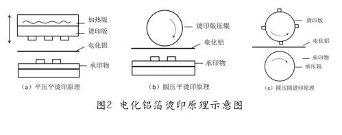 電化(hua)鋁燙(tang)(tang)(tang)印(yin)(yin)的(de)(de)原(yuan)理就是將燙(tang)(tang)(tang)印(yin)(yin)版(ban)安(an)裝在版(ban)臺上并對(dui)其(qi)進行(xing)加熱到(dao)一定(ding)溫(wen)度(du),使(shi)熱熔(rong)性的(de)(de)有(you)機硅樹脂(zhi)隔離(li)層(ceng)(ceng)(ceng)和膠黏層(ceng)(ceng)(ceng)受熱熔(rong)化(hua),片(pian)基層(ceng)(ceng)(ceng)和染色層(ceng)(ceng)(ceng)的(de)(de)黏附力(li)大(da)大(da)降低(di),從而(er)使(shi)轉印(yin)(yin)層(ceng)(ceng)(ceng)(指(zhi)染色層(ceng)(ceng)(ceng)、鍍鋁層(ceng)(ceng)(ceng)、膠黏層(ceng)(ceng)(ceng))與(yu)片(pian)基脫離(li),膠黏層(ceng)(ceng)(ceng)受熱后粘附力(li)增(zeng)強,將帶有(you)色料的(de)(de)鍍鋁層(ceng)(ceng)(ceng)轉印(yin)(yin)到(dao)承印(yin)(yin)物表面。電化(hua)鋁燙(tang)(tang)(tang)印(yin)(yin)的(de)(de)方法有(you)壓(ya)燙(tang)(tang)(tang)法和滾燙(tang)(tang)(tang)法兩種,其(qi)燙(tang)(tang)(tang)印(yin)(yin)原(yuan)理可(ke)分(fen)為(wei)平(ping)壓(ya)平(ping)燙(tang)(tang)(tang)印(yin)(yin)、圓(yuan)壓(ya)平(ping)燙(tang)(tang)(tang)印(yin)(yin)和圓(yuan)壓(ya)圓(yuan)燙(tang)(tang)(tang)印(yin)(yin),其(qi)燙(tang)(tang)(tang)印(yin)(yin)原(yuan)理如(ru)圖2所示。