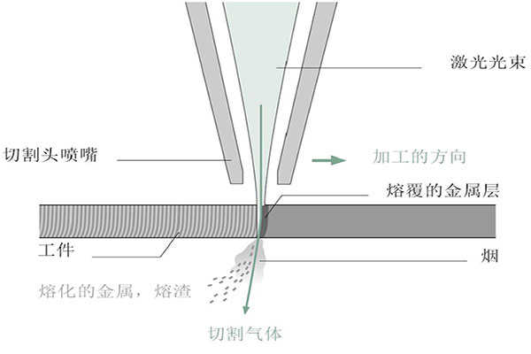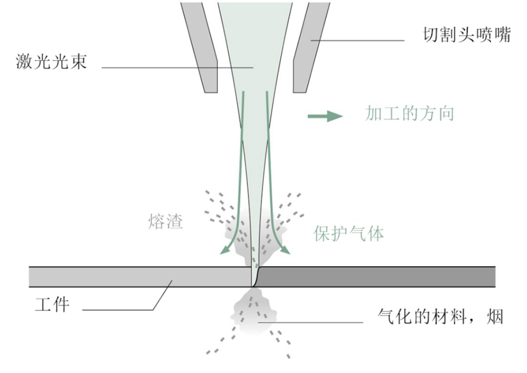 圖1 激光束熔化工件,切割氣吹走切口中的熔融材料和熔渣