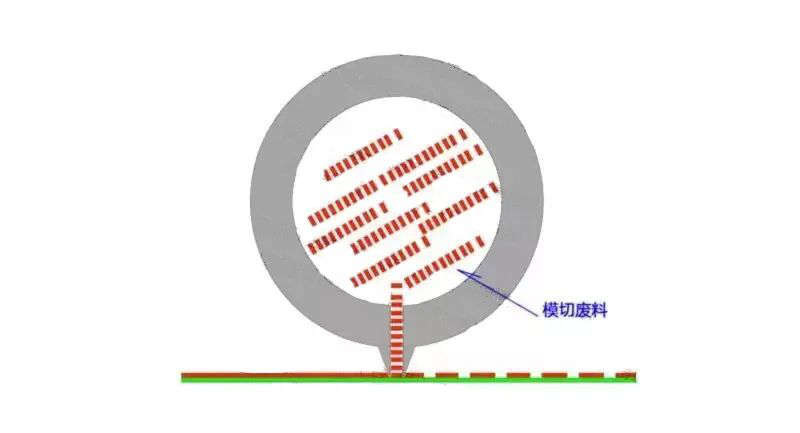 輔料(liao)(liao)直排廢(fei)工藝的刀模(mo)設(she)計(ji)通常采用半斷(duan)模(mo)切設(she)計(ji),成(cheng)型后剝離料(liao)(liao)帶,廢(fei)料(liao)(liao)留在底膜料(liao)(liao)帶上,直接帶走(zou)。如下圖所(suo)示(針(zhen)對(dui)的產品有要(yao)求,廢(fei)料(liao)(liao)部分多為產品內框)。