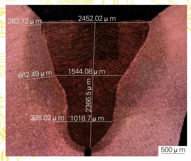 熔池(chi)(chi)寬深(shen)比(bi)(bi)(bi),是指焊(han)縫熔池(chi)(chi)深(shen)度(du)(du)與(yu)寬度(du)(du)的(de)比(bi)(bi)(bi)值。若客戶(hu)對于焊(han)接(jie)產(chan)品有(you)強度(du)(du)要求,需(xu)要將焊(han)接(jie)產(chan)品通(tong)過線切(qie)割→鑲(xiang)嵌(qian)→磨拋→腐蝕→顯微鏡(jing)金相分析這一系列步驟(zou),根(gen)據焊(han)縫的(de)深(shen)寬比(bi)(bi)(bi)值反(fan)映焊(han)接(jie)強度(du)(du),更多(duo)的(de)是硬度(du)(du)方面的(de)體(ti)現,也可通(tong)過拉(la)伸(shen)強度(du)(du)測試反(fan)饋焊(han)接(jie)的(de)拉(la)伸(shen)強度(du)(du)指標(biao)。熔深(shen)比(bi)(bi)(bi)金相分析如圖2所示。