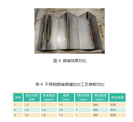 厚度為1.5mm的不銹鋼焊(han)(han)接(jie)焊(han)(han)縫吹白工藝參數對比見表(biao)4,焊(han)(han)接(jie)效果如圖4所示,3條焊(han)(han)縫(從(cong)左到右(you))焊(han)(han)接(jie)參數分別對應表(biao)4中的序號1、2、3。