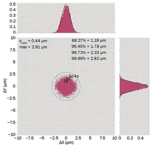 ■圖5:定位誤差的2D散點圖,其設置結合了配備f=100mm的f-theta透鏡掃描系統和同步運動的機械載物臺。沿X軸和Y軸的密度圖分別顯示并呈現出高斯分布